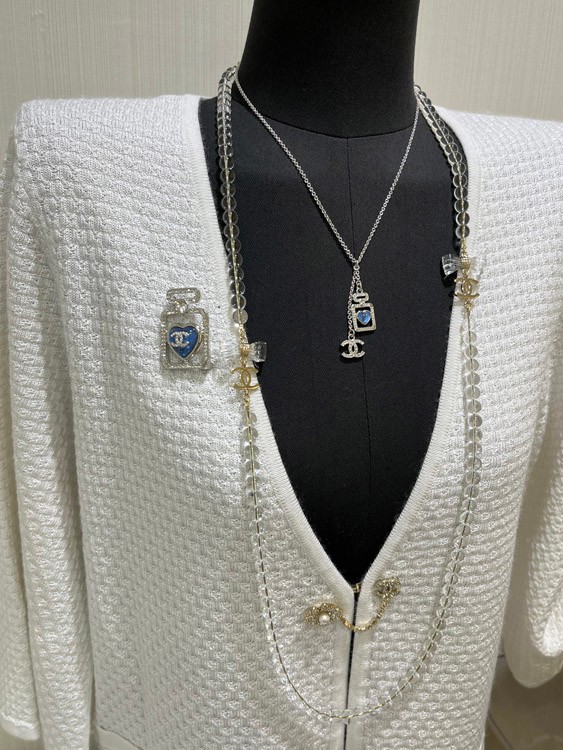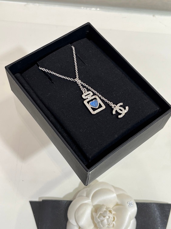 Chanel blue heart silver full diamond double C perfume bottle necklace-3750